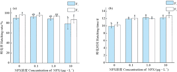 ( 0 μg·L-1代表对照组。a、b和c用于表示F1代不同NPX浓度组之间的显著性差异,x、y和z用于表示F2代不同NPX浓度组之间的显著性差异。标有相同的字母代表同一代不同NPX浓度组之间不存在显著性差异(P>0.05),无相同字母表示存在显著性差异(P < 0.05)。0 μg·L-1 represents the control group. Letters a, b, and c denote significant differences among F1 generation NPX concentration groups, while x, y, and z represent significant differences among F2 generation NPX concentration groups. The presence of the same letter indicates no significant difference NPX between different concentration groups within the same generation (P >0.05), while the absence of the same letters indicates significant differences (P < 0.05). ) 图 1 不同NPX浓度暴露下的青鳉胚胎的孵化率(a)和孵化时间(b) Fig. 1 Hatching rate (a) and hatching time (b) of O. melastigma embryos exposed to different concentrations of NPX |