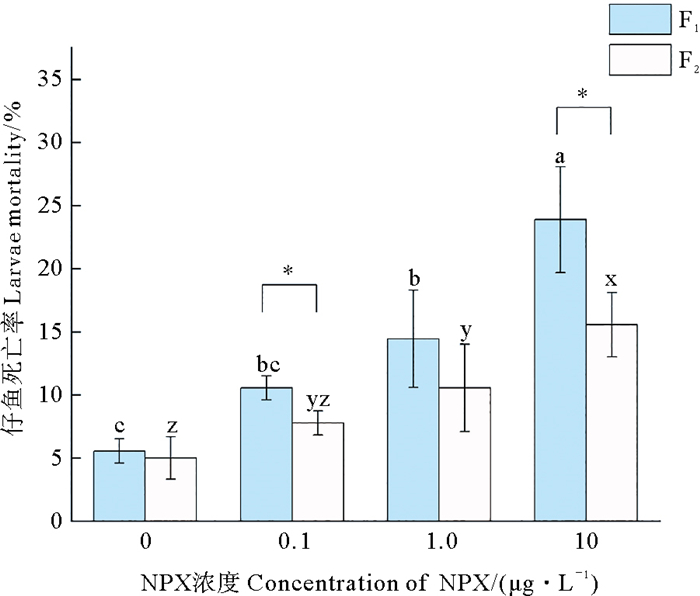 ( 同图 1图注。且不同浓度之间的差异用不同字母表示,同一浓度的两代之间的差异用星号表示。:P<0.05。Same as Fig. 1 caption. The difference between different concentrations was indicated by different letters, and the difference between two generations at the same concentration was indicated by asterisk. : P < 0.05. ) 图 2 不同NPX浓度暴露下的仔鱼死亡率 Fig. 2 Mortality rate of larvae exposed to different concentrations of NPX |