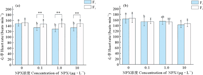 ( 同图 1图注。且不同浓度之间的差异用不同字母表示,同一浓度的两代之间的差异用星号表示。:P<0.01。Same as Fig. 1 caption. The difference between different concentrations was indicated by different letters, and the difference between two generations at the same concentration was indicated by asterisk. : P < 0.01 ) 图 3 不同NPX浓度暴露下受精后5 d(a)和8 d (b)的胚胎心率 Fig. 3 Embryo heart rate of 5 d(a) and 8 d(b) after fertilization exposed to different concentrations of NPX |