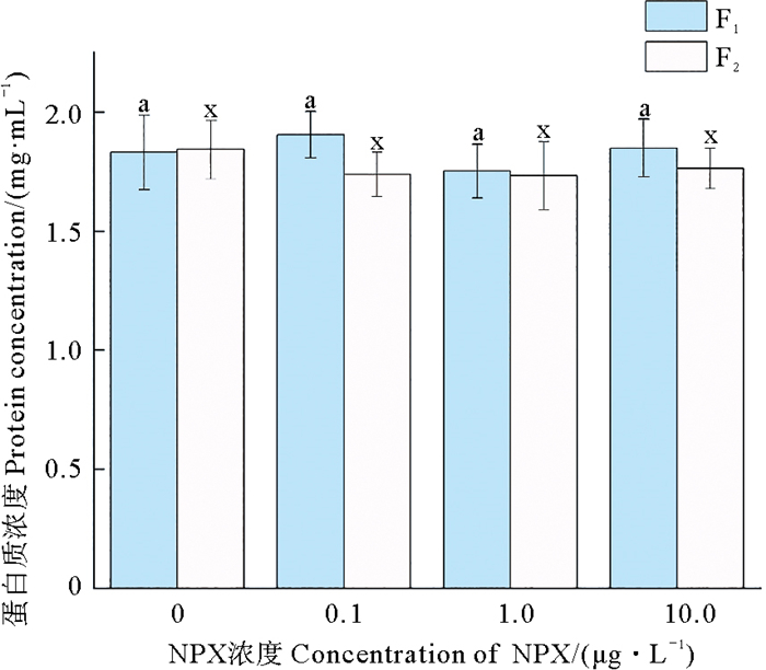 为避免因匀浆浓度差异对实验结果造成影响,首先测定了F1代和F2代受精后8 d胚胎的蛋白质浓度,后续通过均一化方法衡量NPX暴露对海洋青鳉胚胎内与抗氧化系统相关的生物标志物的影响。胚胎总蛋白质浓度如图 4所示。