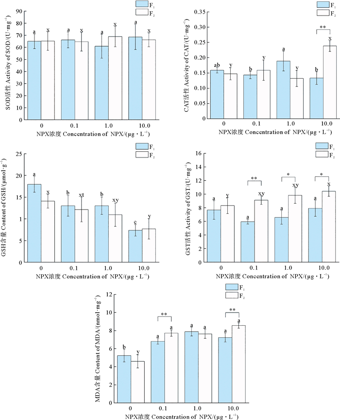 选择SOD活性、CAT活性、GST活性和GSH含量来评估不同NPX浓度暴露下F1代和F2代胚胎在受精后8 d时的抗氧化系统功能,并通过MDA含量判断氧化损伤。检测结果如图 5所示。
