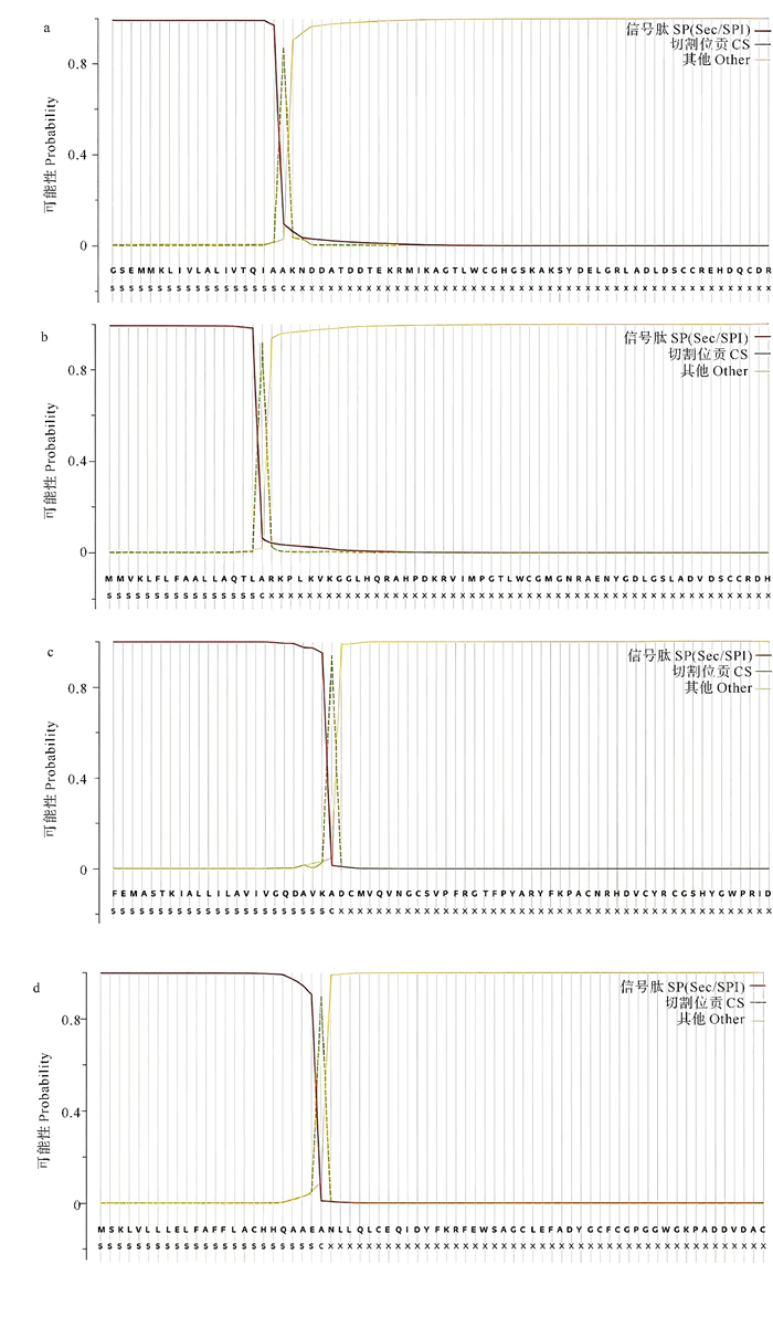 ( (a.PLA2-Ⅰ;b.PLA2-Ⅱ;c.PLA2-Ⅲ;d.PLA2-Ⅳ.) ) 图 1 四种沙海蜇PLA2的信号肽预测 Fig. 1 The prediction of signal peptides for four Nemopilema nomurai PLA2 |