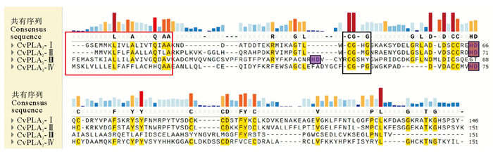 2 结果 2.1 PLA2分子特征的序列分析基于沙海蜇毒液触手转录组筛选获得四个毒素PLA2候选基因,均存在信号肽区域,即引导新合成的PLA2分泌到特定区域便于集中释放的短肽链。采用SignalP 5.0预测四种PLA2的分泌型信号肽(见图 1),结果表明四种PLA2均存在16~23个氨基酸的短分泌肽,呈现典型的sPLA2特征。