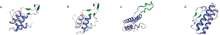 ( (a.PLA2-Ⅰ;b.PLA2-Ⅱ;c.PLA2-Ⅲ;d.PLA2-Ⅳ.) ) 图 3 四种沙海蜇PLA2的SWISS-MODEL结构预测 Fig. 3 The structure prediction of four Nemopilema nomurai PLA2 by SWISS-MODEL |