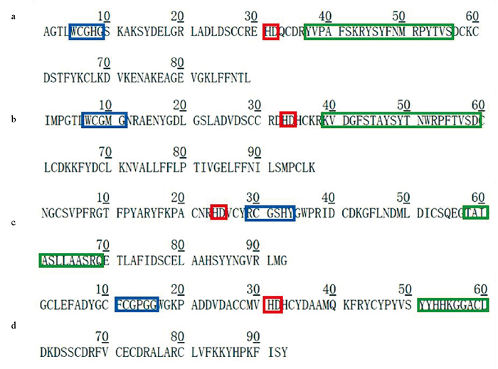 ( a.PLA2-1;b.PLA2-2;c.PLA2-3;d.PLA2-4。其中蓝框内为Ca2+结合环,红框内为催化活性中心,绿框内为β转角。a.PLA2-1;b.PLA2-2;c.PLA2-3;d.PLA2-4. The blue box contains the Ca2+ binding ring, the red box contains the catalytic active site, and the green box contains the β-turn. ) 图 5 四种沙海蜇截短体PLA2的磷脂酶活性结构域序列 Fig. 5 The sequence of the phospholipase activity domain of four Nemopilema nomurai PLA2 truncations |