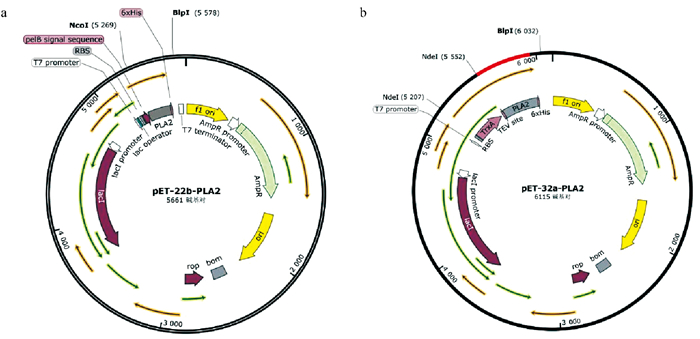 ( (a. pET-22b; b. pET-32a.) ) 图 6 表达质粒构建图谱 Fig. 6 Expression plasmid construction map |