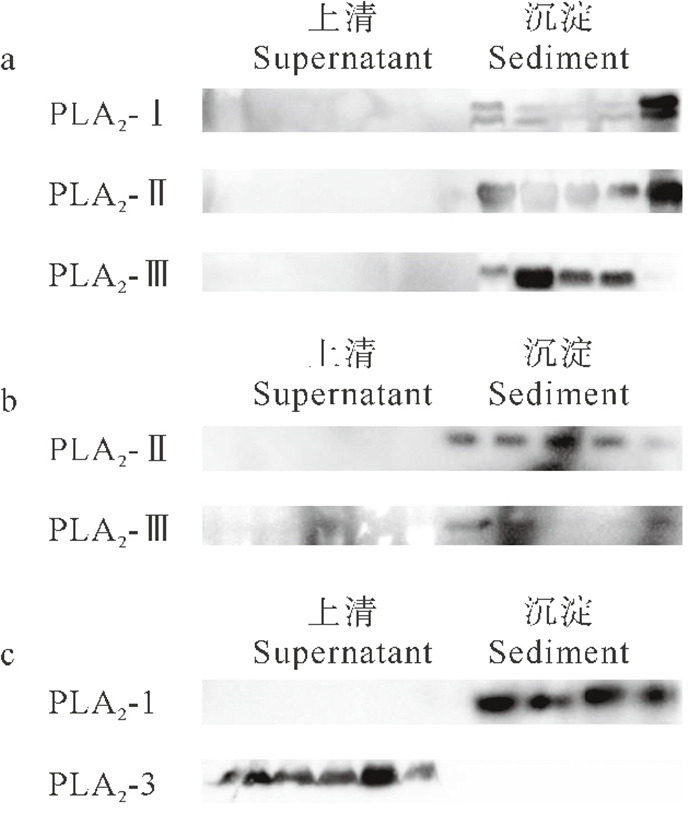 ( a.pET-22b质粒表达三种全序列PLA2;b. pET-32a表达两种全序列PLA2;c. pET-22b质粒表达截短体PLA2。a. The full sequence PLA2 expressed by the pET-22b plasmid; b. The full sequence PLA2 expressed by the pET-32a; c. The truncated PLA2 expressed by the pET-22b plasmid. ) 图 7 两种质粒表达PLA2的Western Blot检测 Fig. 7 Western Blot of two plasmids expressing PLA2 |
