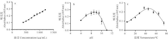 1.2.6 酶活性检测基于比色法测定PLA2活性:反应体系含200 μL缓冲液(20 mmol/L NaH2PO4, 150 mmol/L NaCl, pH=8.0)、25 μL NOBA(NOBA溶于乙腈,1 mg/mL)及25 μL粗提蛋白上清液(空白对照用缓冲液代替蛋白溶液)。37 ℃孵育1 h后,测定405 nm处的吸光度。通过改变温度条件、缓冲液pH,进行粗蛋白浓度为1 000 μg/mL的酶活性检测,每组设置三个重复,通过Prism软件拟合曲线。
