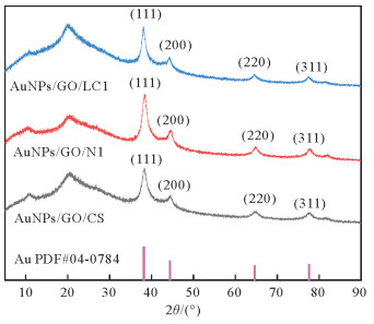 图 1 AuNPs/GO/CS、AuNPs/GO/N1和AuNPs/GO/LC1的XRD图谱 Fig. 1 XRD patterns of AuNPs/GO/CS, AuNPs/GO/N1 and AuNPs/GO/LC1 |