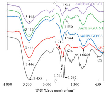图 2 CS、GO、AuNPs/GO/CS、AuNPs/GO/N1和AuNPs/GO/LC1的FT-IR光谱 Fig. 2 FT-IR spectra of CS, GO, AuNPs/GO/CS, AuNPs/GO/N1 and AuNPs/GO/LC1 |