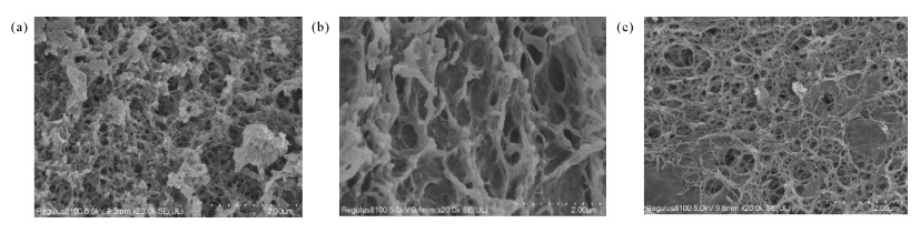 图 3为AuNPs/GO/CS、AuNPs/GO/N1和AuNPs/GO/LC1的SEM图。由图可知,水凝胶表面粗糙,整体形貌呈现多孔三维网络结构,具有丰富的孔隙结构,且孔隙分布相对均匀。水凝胶的多孔结构为其提供了较大的比表面积,在一定程度上会阻止AuNPs的团聚[24]。