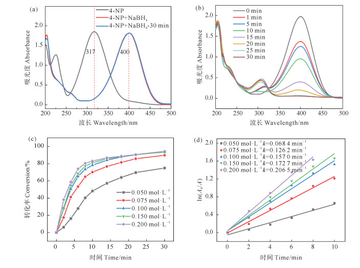 图 4(a)为4-NP溶液、4-NP和NaBH4混合溶液的UV-vis光谱图。4-NP溶液的最大吸收峰在317 nm。加入NaBH4后在400 nm处出现4-NPi的吸收峰[26]。4-NP和NaBH4混合溶液在30 ℃下振荡30 min后400 nm处的峰值无明显改变,表明未添加催化剂时,该反应在动力学上是受限的[27]。