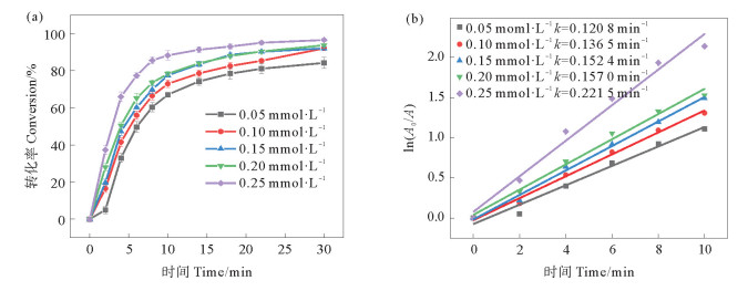 2.2.2 4-NP浓度的影响AuNPs/GO/CS催化还原不同浓度的4-NP转化率随时间变化的关系图和动力学方程拟合图如图 5所示。当4-NP浓度从0.05 mmol·L-1增大至0.25 mmol·L-1时,反应至30 min,4-NP转化率从84.2%升高至96.5%,反应速率常数由0.120 8 min-1增大至0.221 5 min-1。这可能是因为AuNPs负载在GO/CS水凝胶上,因空间位阻效应影响其与4-NP的吸附与接触,而小分子BH4-可吸附到AuNPs表面并生成活性氢,4-NP在碰撞时捕获活性氢被还原为4-AP。因此,随着4-NP浓度的增大,反应速率增大,反应规律遵循Eley-Rideal (E-R)机理[29]。