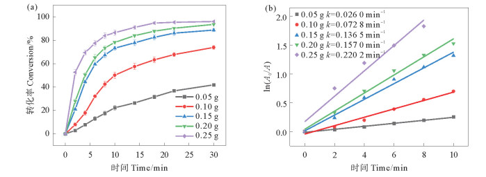 催化剂投加量对4-NP催化还原性能的影响如图 6所示。当AuNPs/GO/CS投加量为0.05 g时,反应在30 min时4-NP转化率仅为42.0%,反应速率常数为0.026 0 min-1。当催化剂投加量从0.10 g增加至0.25 g时,30 min时4-NP转化率由74.0%增大到96.1%,反应速率常数由0.072 8 min-1增大至0.220 2 min-1。当AuNPs/GO/CS增多时,更多的催化反应活性位点与BH4-接触,生成更多的活性氢,从而增大了反应速率。