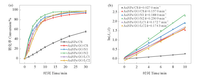 图 7 AuNPs/GO/CHS催化还原4-NP转化率(a)和ln(A0/A)随时间t变化(b) Fig. 7 Conversion of the catalytic reduction reaction of 4-NP with AuNPs/GO/CHS(a) and ln(A0/A) versus time t (b) |