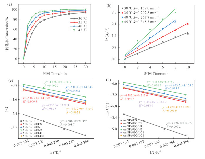 2.2.5 活化能及热力学分析图 8(a)和(b)显示了以AuNPs/GO/CS为催化剂时,在不同温度下催化还原4-NP转化率及动力学方程拟合图。温度从30 ℃升高至45 ℃,反应30 min时,4-NP转化率从93.7%增大到99.9%,速率常数k由0.157 0 min-1增大至0.345 3 min-1。由此可见,在研究的范围内,随着温度的升高,反应速率增加。这归因于反应体系温度的升高,更有利于活化反应分子,分子扩散速度变快,反应物与催化剂的碰撞频率增加[35]。