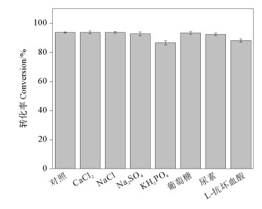 2.2.6 环境应用的可行性实际废水中成分较复杂,研究废水中可能存在的无机离子及有机物对AuNPs/GO/CHS催化还原4-NP的影响至关重要。选择CaCl2、NaCl、Na2SO4、KH2PO4、葡萄糖、尿素和L-抗坏血酸,探究其对AuNPs/GO/CS催化还原4-NP活性的影响。图 9为无机离子及有机物对AuNPs/GO/CS催化还原4-NP活性的影响,当无机离子及有机物浓度是4-NP浓度100倍时,未对4-NP的催化还原形成竞争作用。表明该催化剂具有良好的抗干扰特性,在工业废水处理应用中具有可行性。