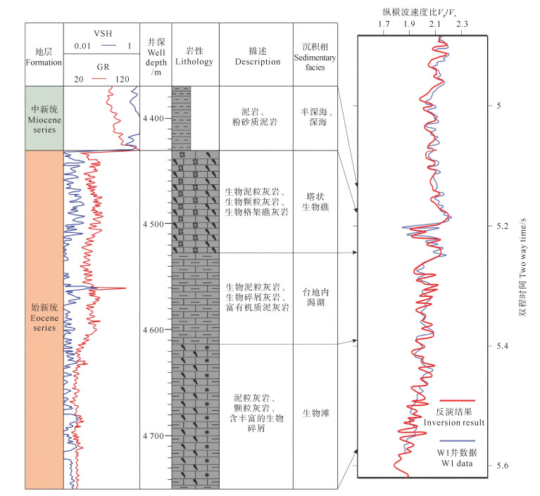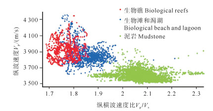 2.2 应用效果分析本文选择W1井进行分析研究,该井钻遇古新统-始新统碳酸盐岩台地生物礁,厚度约300 m[47]。本文所选的AA′地震测线与W1井相距约400 m,且都经过同一个孤立碳酸盐岩台地,岩相、沉积相变化不明显。对该井进行弹性参数交会分析,图 3中的红点表示生物礁,主要由生物泥粒灰岩和生物颗粒灰岩组成;蓝点表示生物滩和台地内潟湖,主要由泥粒灰岩和颗粒灰岩组成。发现生物礁与其他碳酸盐岩波阻抗相互重叠,难以区分生物礁储层与非储层,而纵横波速度比则能够较好区分生物礁储层与非储层(见图 3),因此本文选择纵横波速度比作为研究区生物礁储层敏感参数。