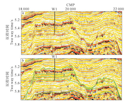 ( a.原始剖面Original section;b.地震相解释成果Seismic facies interpretation results。) 图 4 生物礁地震相特征 Fig. 4 Seismic facies characteristics of biological reefs |