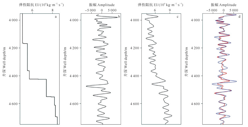 根据公式(6)构建虚拟井曲线。图 5为其中一口虚拟井的近角度弹性阻抗曲线构建过程,相约束离散模型在多种先验信息的约束下,弹性阻抗的变化符合实际地层变化特征;90°相移地震属性的振幅变化节点能够与相约束离散模型弹性阻抗的变化节点大致对应,将相约束离散模型与90°相移地震属性相结合,构建虚拟井曲线。从图 5d可以看出,红色曲线所表示的虚拟井井旁道合成的地震记录与蓝色曲线所表示的实际地震记录吻合较好,表明构建的虚拟井曲线符合实际地层变化特征,具有可靠性。