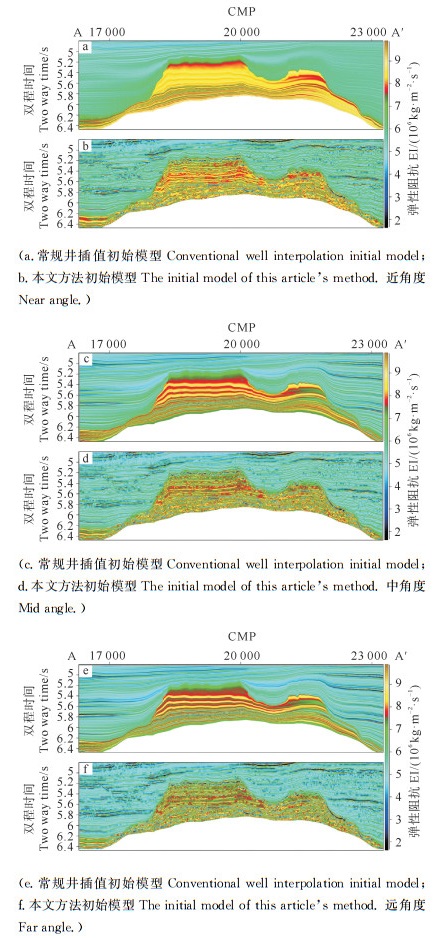 图 6分别为三个角度下常规虚拟井插值构建的反演初始模型和基于FFT-MA协模拟构建的反演初始模型。由于缺乏实井数据,通过常规井插值构建的反演初始模型难以表征地层真实情况;基于FFT-MA协模拟构建的反演初始模型,在相控约束下,结合90°相移地震属性,使反演初始模型的同相轴与实际地震资料同相轴相互对应,同时通过FFT-MA协模拟,构建出的模型具有一定的随机性,符合实际地层的变化特征。