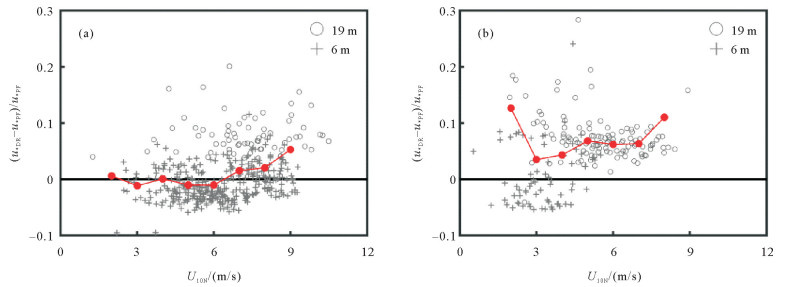 ( U10N为海面10 m风速,纵坐标代表二次旋转与平面拟合法校正后的空气摩擦速度的相对偏差。图(a)是-0.1<z/L<0.1条件情况,图(b)是z/L≥0.1条件情况。图中圆圈为19 m高度处数据,加号为6 m高度处数据。U10N is the 10 m wind speed over the sea surface, and the ordinate denotes the relative deviation of the air friction velocity derived from the double rotation method versus the planar fit method. Figure (a) shows the case for-0.1<z/L<0.1, and figure (b) corresponds to z/L≥0.1. In the figures, circles represent data at 19 m height, while plus signs denote data at 6 m height. ) 图 10 不同大气稳定度条件下二次旋转和平面拟合法计算出的摩擦速度相对误差情况 Fig. 10 The relative errors in friction velocity calculated using the double rotation and planar fit methods under different atmospheric stability conditions |