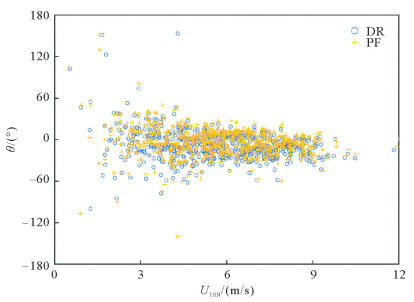 ( θ是风应力方向与风向的夹角,U10N为海面10 m风速。θ is the angle of the wind stress direction relative to the wind direction, and U10N is the 10 m wind speed over the sea surface. ) 图 11 二次旋转和平面拟合方法下风应力方向和风向之间的夹角与风速的关系 Fig. 11 The relationship between the angle of the wind stress direction relative to the wind direction and the wind speed under double rotation and planar fit methods |