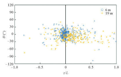 图 12为风应力方向与风向夹角θ与大气层结稳定度参数z/L的关系,同时将数据分为高度6和19 m两组。显然,当大气层结接近于中性稳定时,风应力与风向的夹角分布集中在0°附近,此时风应力方向与风向是几乎一致的;在大气层结稳定条件下,风应力与风向夹角为负值的数据约占65%,此时风应力在风矢量左侧,且一般在0°~-20°之间,这与Geernaert等[24, 37]和陈胜等[36]的结果一致,但偏离角度随z/L增大而增大。对于不稳定情形,两者的夹角没有明显的倾向性,且当大气层结偏向更不稳定时,夹角变动范围变大的趋势早于稳定情况,但平均而言,风应力方向与风向趋于一致,这与陈胜等[36]的结果存在差异。