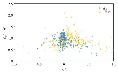 ( CD是风应力拖曳系数,z/L是大气稳定度参数。CD is the drag coefficient, and z/L is the atmospheric stability parameter. ) 图 13 拖曳系数与稳定度参数z/L的关系 Fig. 13 Relationship between drag coefficient and stability parameter z/L |
