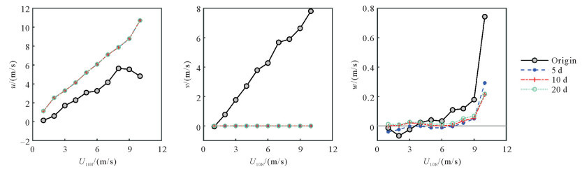 ( U10N为海面10 m风速,u、v和w为风速分量。图中圆圈为速度分量的平均值,平均区间为1 m/s。‘origin’代表未经倾斜校正的原始数据。U10N is the 10 m wind speed over the sea surface, and u, v, and w are the wind speed components. The circles represent velocity components averaged over 1 m/s bins. With 'origin' denoting the data without tilt correction. ) 图 2 不同平面拟合时间对速度分量的影响 Fig. 2 Impact of varying planar fitting times on velocity components |