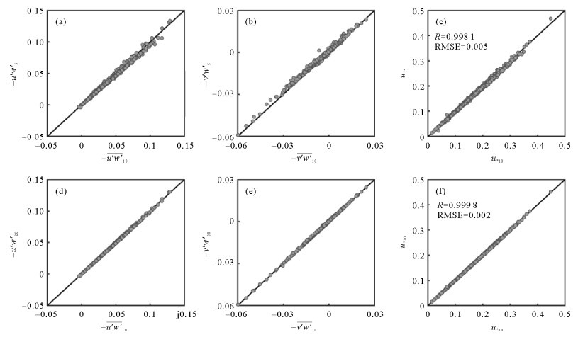 图 2展示了三种不同平面拟合时间对速度分量的校正情况,可以看出不同平面拟合时间对垂向平均风速的校正效果存在差异,以5 d的数据进行平面拟合校正后的平均垂向风速(w)略小于10和20 d的平均垂向风速校正结果,三种平面拟合时间下w的量级多位于10-2~10-1之间。不同平面拟合时间的平面拟合对u和v校正结果相似,其中v的数量级在10-16左右。如图 3所示,不同拟合平面情况下的动量通量计算结果有着极高的一致性,当平面拟合时间为5和10 d时,计算出的摩擦速度之间的均方根误差为0.005 m/s,当平面拟合时间为10和20 d时,计算出的摩擦速度之间的均方根误差为0.002 m/s,这些偏差很小,几乎可以忽略。因此,当选用足够长的时段进行平面拟合时,不同拟合时长计算的动量通量极为相近。在后续研究中,平面拟合法均采用10 d的时间长度计算拟合平面。