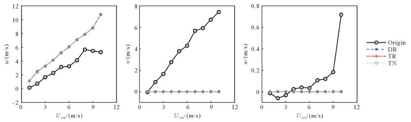 ( U10N为海面10 m风速,u、v和w为风速分量。图中圆圈为速度分量的平均值,平均区间为1 m/s。‘origin’代表未经倾斜校正的原始数据。U10N is the 10 m wind speed over the sea surface, and u, v, and w are the wind speed components. The circles represent velocity components averaged over 1 m/s bins. With ′origin′ denoting the data without tilt correction. ) 图 4 二次旋转(DR)、限制第三次旋转角度的三次旋转(TR)和不限制第三次旋转角度的三次旋转(TN)对速度分量的影响 Fig. 4 The influence of double rotation (DR), restricted third-angle triple rotation (TR), and unrestricted third-angle triple rotation (TN) on velocity components |
