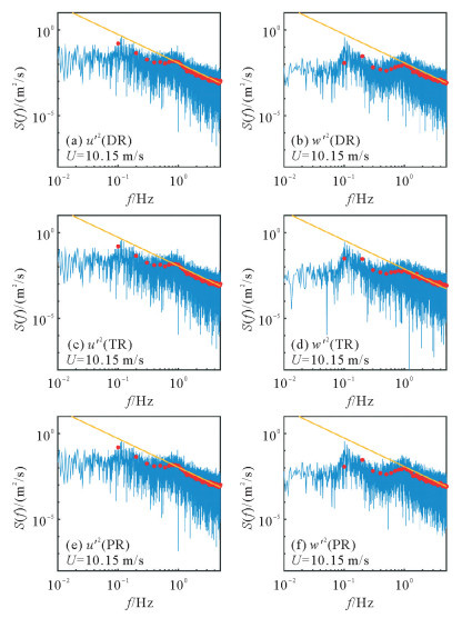 图 6为经3种不同倾斜校正方法处理得到的沿风向和垂向的湍动能谱与Kolmogorov的-5/3指数律的对比,对应风速为10.15 m/s,图 6中直线对应-5/3指数律,红点为0.1 Hz间隔的平均谱值。从图 6中可以看到,3种倾斜校正方法给出的沿风向和垂向的湍动能谱均大体满足-5/3指数律,满足惯性耗散法计算动量通量的要求。换句话说,这3种倾斜校正方法对高频域的信号影响较小。