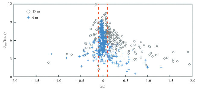( U10N为海面10 m风速,z/L为大气稳定度参数。图中红虚线位置为-0.1和0.1。U10N is the 10 m wind speed over the sea surface, and z/L is the atmospheric stability parameter. The red dashed lines indicate the positions of-0.1 and 0.1 in the figure. ) 图 7 19和6 m高度处大气层结稳定度情况 Fig. 7 Stability conditions of atmospheric stratification at 19 and 6 m heights |