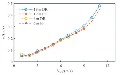 ( U10N为海面10 m风速,u*为空气摩擦速度。U10N is the 10 m wind speed over the sea surface, and u* is air friction velocity. ) 图 8 19和6 m高度处经二次旋转方法和平面拟合法计算出的摩擦速度对比 Fig. 8 Comparison of friction velocities calculated using the double rotation method and the planar fit method at heights of 19 and 6 m |