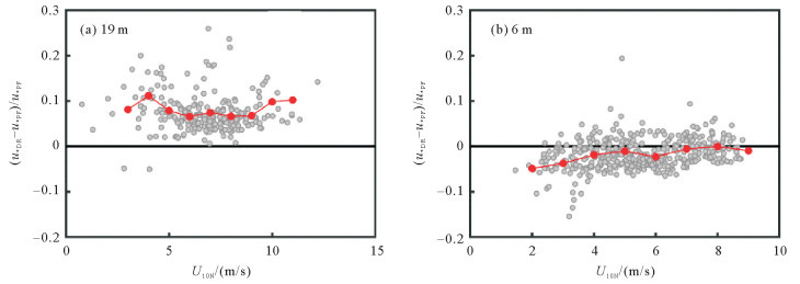( U10N为海面10 m风速,纵坐标代表二次旋转与平面拟合法校正后的空气摩擦速度的相对偏差。图(a)(b)分别代表 19 m高度和6 m高度处二次旋转与平面拟合法计算出的摩擦速度相对误差情况。灰色圆点代表两种倾斜校正方法处理后摩擦速度的相对误差,红色圆点代表摩擦速度相对误差均值,间隔为1 m/s。U10N is the 10 m wind speed over the sea surface, and the ordinate denotes the relative deviation of the air friction velocity derived from the double rotation method versus the planar fit method. Figures (a) and (b) show the relative error distributions of friction velocity calculated by the double rotation method and planar fit method at 19 m height and 6 m height, respectively. The gray dots represent scatter plots of relative errors in friction velocity after processing with these two tilt correction methods, whilethe red dots represent the mean relative error of friction velocity, spaced at intervals of 1 m/s. ) 图 9 两种旋转方法对不同观测高度处摩擦速度的影响对比 Fig. 9 Comparison of the effects of two rotation methods on friction velocity at different observation heights |