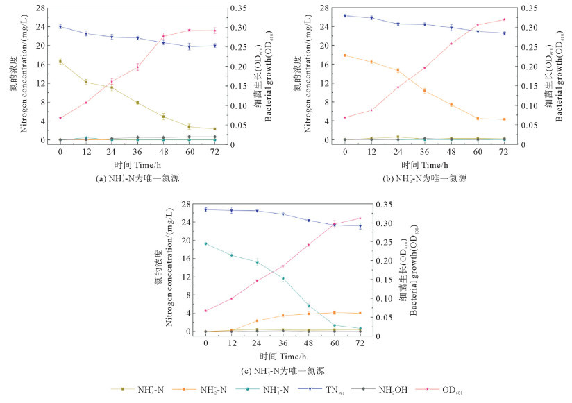 图 1 NH4+-N(a)、NO2--N(b)和NO3--N(c)作为唯一的添加氮源时芽孢杆菌C3的生长情况和氮转化性能 Fig. 1 The growth and nitrogen transformation performance of strain C3 when NH4+-N (a), NO2--N (b), and NO3--N (c) were added as sole nitrogen sources |
