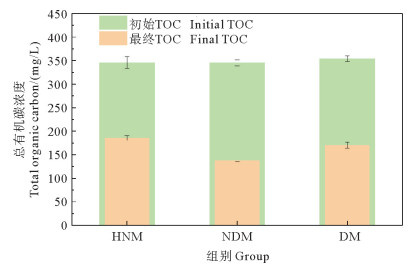 ( HNM表示以NH4+-N为唯一氮源组;NDM表示以NO2--N为唯一氮源组;DM表示以NO3--N为唯一氮源组。下同。HNM represents the group with NH4+-N as sole nitrogen source; NDM represents the group with NO2--N assole nitrogen source; DM represents the group with NO3--N as sole nitrogen source.The same applies to subsequent figures and tables. ) 图 2 菌株C3在不同氮源中体系总有机碳(TOC)72 h前后对比 Fig. 2 Total organic carbon (TOC) concentrations in different nitrogen source media before and after 72 h of cultivation with strain C3 |