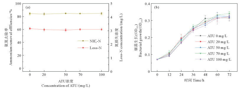 2.2 菌株C3的氨氧化过程抑制在以NH4+-N为唯一氮源的HNM培养基中添加不同浓度(0、20、50、70和100 mg/L)的抑制剂ATU,培养72 h,各处理组的氨氮去除率和氮损失未见显著影响(见图 3(a)),在不同培养基中菌株C3生长趋势相似(见图 3(b))。