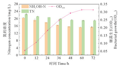 在21 mg/L的NH2OH-N培养基中每隔12 h测定培养基OD600、总氮(TN)和NH2OH-N浓度。