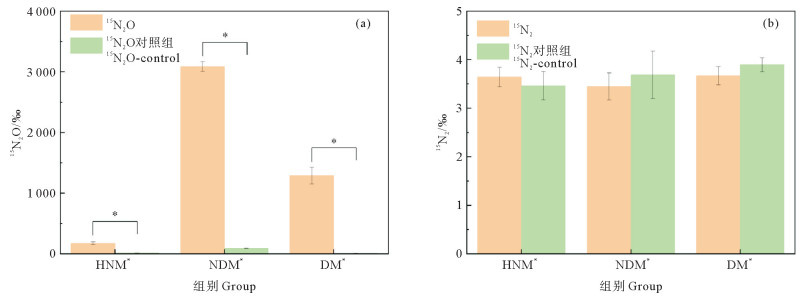 图 5 菌株C3在3种氮源中的15N2O(a)和15N2(b)的同位素检测结果 Fig. 5 Isotope detection results of strain C3 at 15N2O(a) and 15N2(b) in three nitrogen sources |