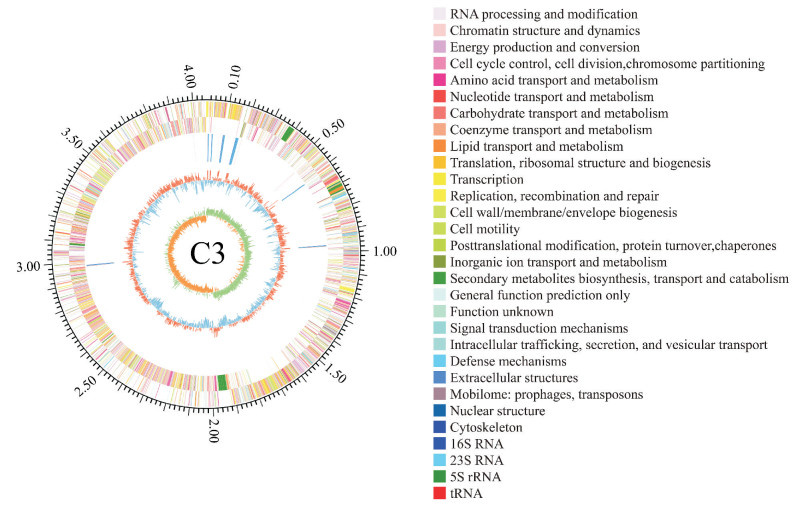 菌株C3的基因组大小为4 057 290 bp,GC含量43.68%,基因组圈图见图 6。