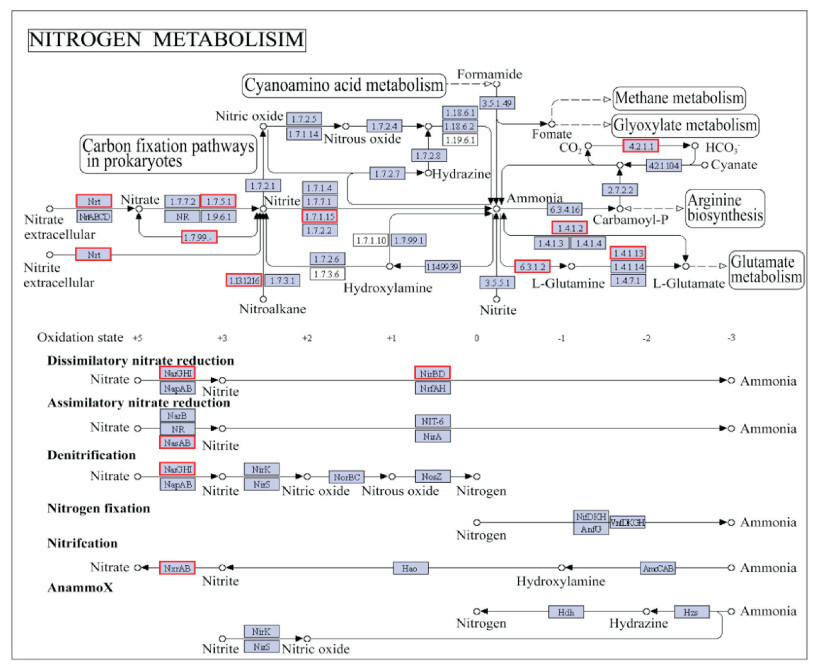 图 8 使用KEGG数据库预测的菌株C3的氮转化途径 Fig. 8 Nitrogen transformation pathway of strain C3 predicted by KEGG databa |