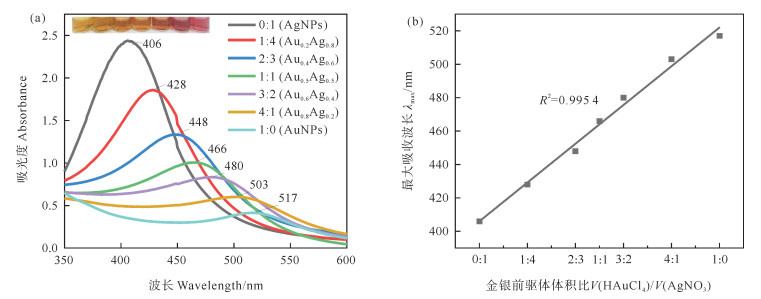 3 结果与讨论 3.1 Au-Ag NPs的制备 3.1.1 金银前驱体体积比的影响图 1(a)为不同金银前驱体体积比(V(HAuCl4)/V(AgNO3))制备Au-Ag NPs的UV-vis光谱图。Au-Ag NPs的SPR吸收峰源于表面自由电子的集体振荡与入射光之间的耦合作用,其最大吸收波长(λmax)与Au-Ag NPs的组成密切相关。溶胶颜色是SPR特性的一种直观表现[24],如图所示,AgNPs和AuNPs溶胶分别为黄色和酒红色,对应于406和517 nm处的SPR吸收峰。随着V(HAuCl4)/ V(AgNO3)由1∶4增大至4∶1,Au-Ag NPs溶胶逐渐从黄色向酒红色过渡,λmax也由428 nm逐渐红移至503 nm,且λmax与V(HAuCl4)/V(AgNO3)具有较好的线性相关性(见图 1(b))。结果表明,通过调控金银前驱体体积比,可以制备出具有不同Au、Ag元素组成的Au-Ag NPs[15]。