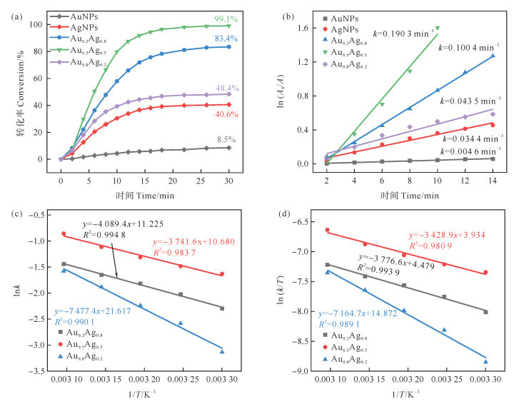图 10 Au-Ag NPs催化还原4-NP反应的转化率(a)和ln(A0/A) (b)随时间t变化图, 不同温度下lnk (c)和ln(k/T) (d) 随1/T的变化图 Fig. 10 Plots of conversion (a) and ln(A0/A) (b) for the catalytic reduction of 4-NP reaction by Au-Ag NPs versus time t, plots of lnk (c) and ln(k/T) (d) versus 1/T at different temperatures |