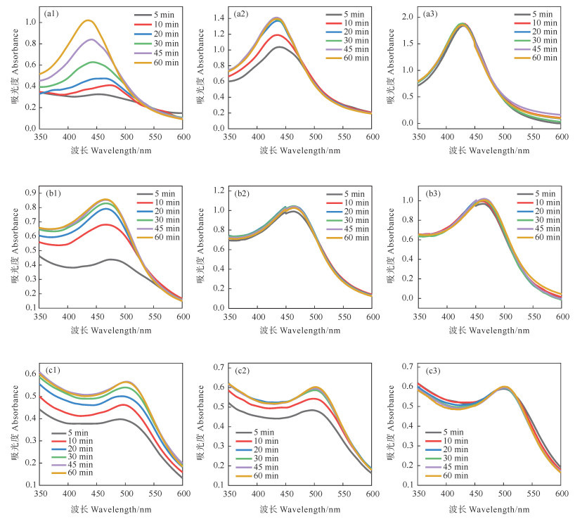 ( 50 ℃((a1),(b1),(c1));60 ℃((a2),(b2),(c2));70 ℃((a3),(b3),(c3))。) 图 2 不同反应温度和时间下制备Au0.2Ag0.8(a), Au0.5Ag0.5(b), Au0.8Ag0.2(c)的UV-vis光谱图 Fig. 2 UV-vis spectra of Au0.2Ag0.8 (a), Au0.5Ag0.5 (b), Au0.8Ag0.2 (c) synthesized at different reaction temperatures and times |