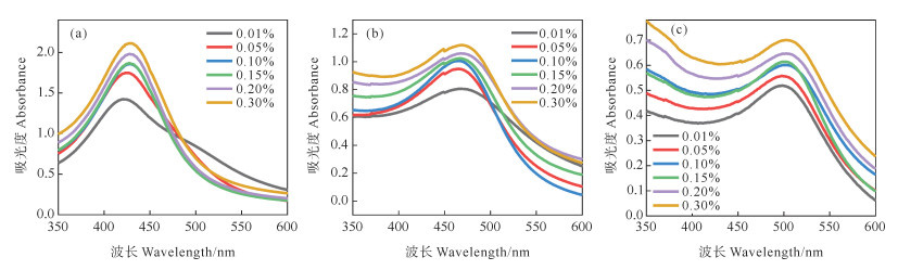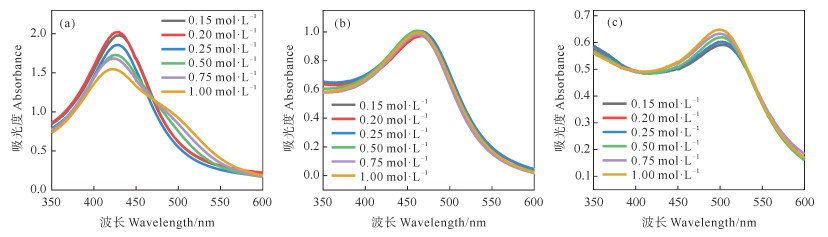 3.1.3 NaOH浓度的影响不同NaOH浓度下制备Au-Ag NPs的UV-vis光谱图如图 3所示。Au0.2Ag0.8(见图 3(a))的SPR峰随着NaOH浓度的增加有明显变化,当NaOH浓度在研究范围内增大时,Au0.2Ag0.8的SPR峰的λmax由430 nm逐渐蓝移至423 nm。当NaOH浓度较高(0.5~1 mol·L-1)时,Au0.2Ag0.8的SPR峰强度明显降低,半峰宽增大,在500 nm左右处出现肩峰。这可能是因为高浓度NaOH时容易形成较大尺寸的Au0.2Ag0.8,制备的双金属纳米粒子具有较宽的粒径分布。由于Ag(Ⅰ)的氧化还原电位较低,在酸性和中性环境下不易被WSC还原,OH—的加入可以使Ag(Ⅰ)形成AgOH,AgOH会分解产生中间体Ag2O,从而增大了Ag(Ⅰ)的氧化还原电位,更有利于Ag(Ⅰ)的还原。对于Au0.5Ag0.5(见图 3(b))和Au0.8Ag0.2(见图 3(c)),NaOH浓度对SPR峰位置均无明显影响。其中,Au0.8Ag0.2的SPR峰强度随着NaOH浓度的增加而略有增大。