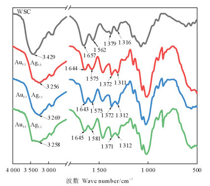 WSC和Au-Ag NPs的FT-IR光谱图如图 5所示。WSC在3 429 cm-1处的宽吸收峰可归属为—OH和—NH基团的重叠伸缩振动[27]。1 657和1 562 cm-1处的特征峰分别归属为酰胺Ⅰ中—NHCOCH3的—C=O的伸缩振动和酰胺Ⅱ中NH的面内伸缩振动。1 379和1 316 cm-1处的两个特征峰归属为酰胺Ⅲ的C—N伸缩振动和—OH的变形振动[28]。Au0.5Ag0.5的FT-IR光谱图中,WSC位于3 429、1 657和1 562 cm-1处的伸缩振动峰分别位移至3 269、1 643和1 575 cm-1,表明WSC分子中的—NH将Au(Ⅲ)和Ag(Ⅰ)还原为零价Au和Ag原子,进而形成Au-Ag NPs。同时,WSC中的—OH、—NH和—NHCOCH3通过配位作用和静电吸附作用包覆于Au-Ag NPs表面,使其具备良好的稳定性[29]。Au0.2Ag0.8、Au0.8Ag0.2与Au0.5Ag0.5的FT-IR光谱图相似。