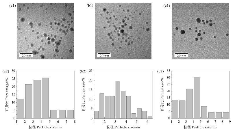 图 6 Au0.2Ag0.8(a), Au0.5Ag0.5(b), Au0.8Ag0.2(c)的TEM图((a1),(b1),(c1))及粒径分布直方图((a2),(b2),(c2)) Fig. 6 TEM images ((a1), (b1), (c1)) and histograms of particle size distribution ((a2), (b2), (c2)) of Au0.2Ag0.8 (a), Au0.5Ag0.5 (b), and Au0.8Ag0.2 (c) |