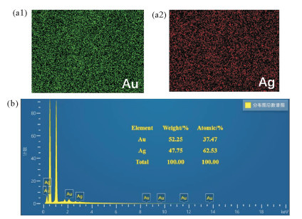 图 7 Au0.5Ag0.5的元素映射图((a1),(a2))和EDS能谱图(b) Fig. 7 Elemental mapping spectra((a1), (a2)) and EDS energy spectra(b) of Au0.5Ag0.5 |